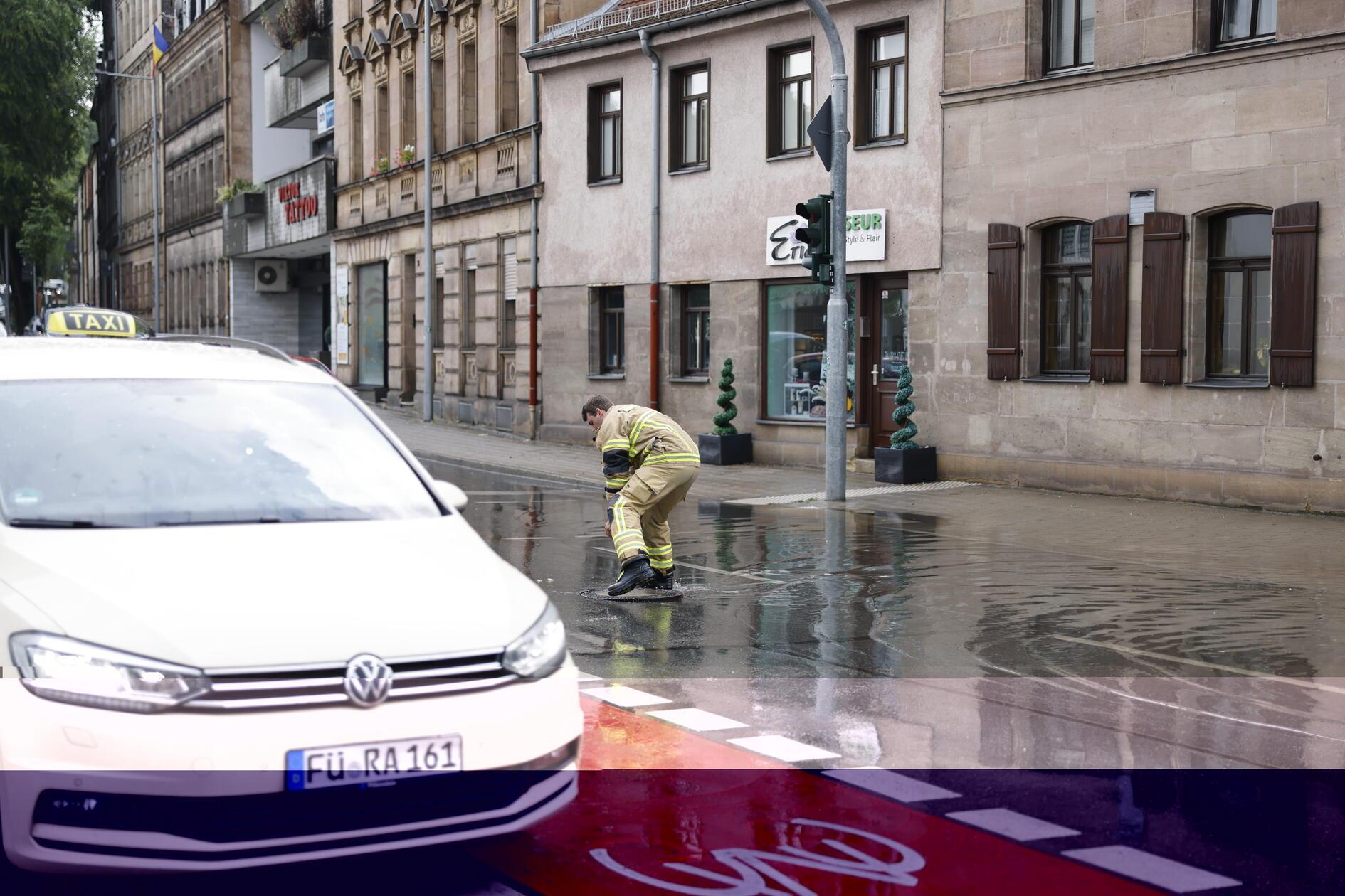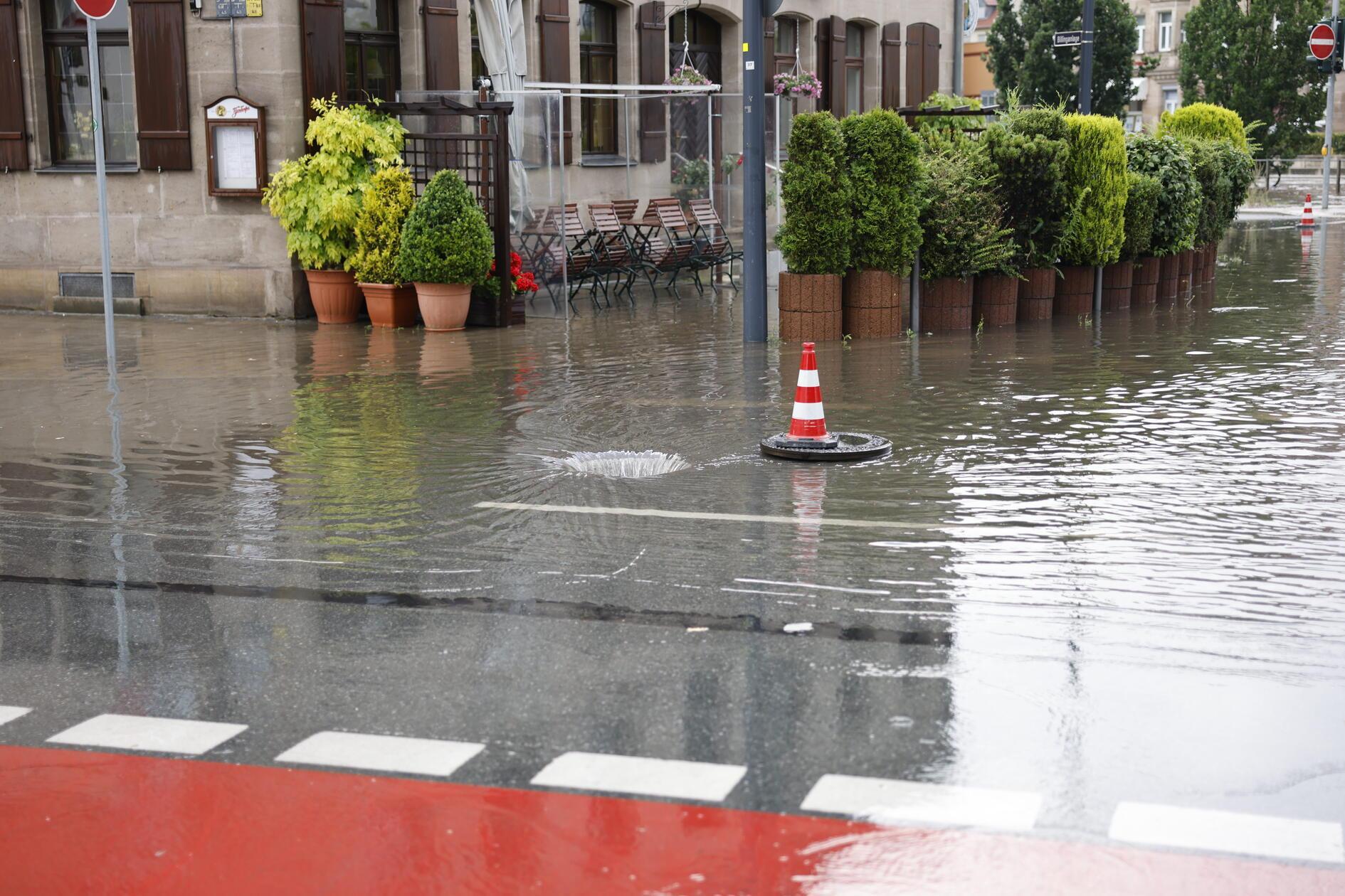 Am Donnerstag hat ein Gewitter mit Starkregenfällen mehrere Straßen in Fürth überflutet, die Feuerwehr musste ausrücken. Vor allem im Bereich rund um die Billinganlage kam so viel Wasser herunter, dass mehrere Gullydeckel hochgedrückt wurden.