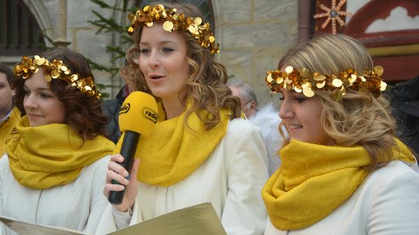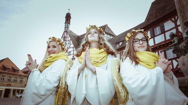 4/21 - Die drei Forchheimer Weihnachtsengel 2022: Hannah Stöhr (22) aus Leutenbach, Jana Dötzer (25) aus Forchheim und Leonie Müller (26) aus Forchheim-Reuth (v.l.). © Athina Tsimplostefanaki, NNZ